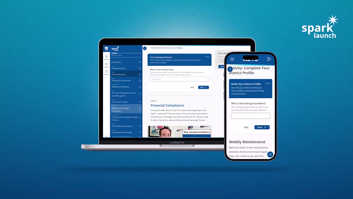 At the National Democratic Training Committee (NDTC), we train Democrats to run effective, winning campaigns at every level of government. Our free online trainings help build the bench of progressive leaders across the country. This is the work of strengthening our democracy. And we offer it all for free. Online. And accessible anywhere, anytime.